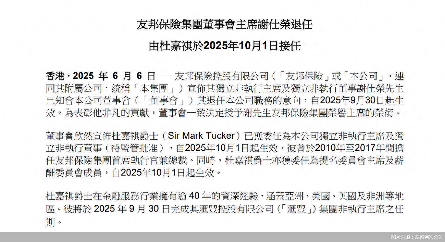 北京商报讯(记者 李秀梅)6月6日股票配资网,友邦保险在港交所公告,宣布其独立非执行主席及独立非执行董事谢仕荣将退任,9月30日起生效;杜嘉祺将于10月1日接任,杜嘉祺任职待监管批准。